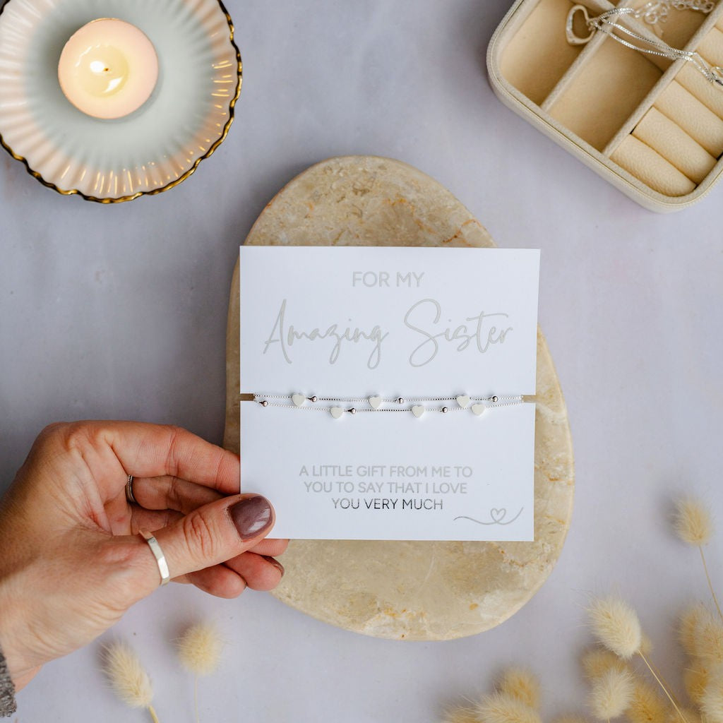 Celebrate your Sister with this For My Amazing Sister bracelet, a charming and meaningful keepsake she will treasure for years. It features delicate heart charms that symbolises the special bond and love you share.