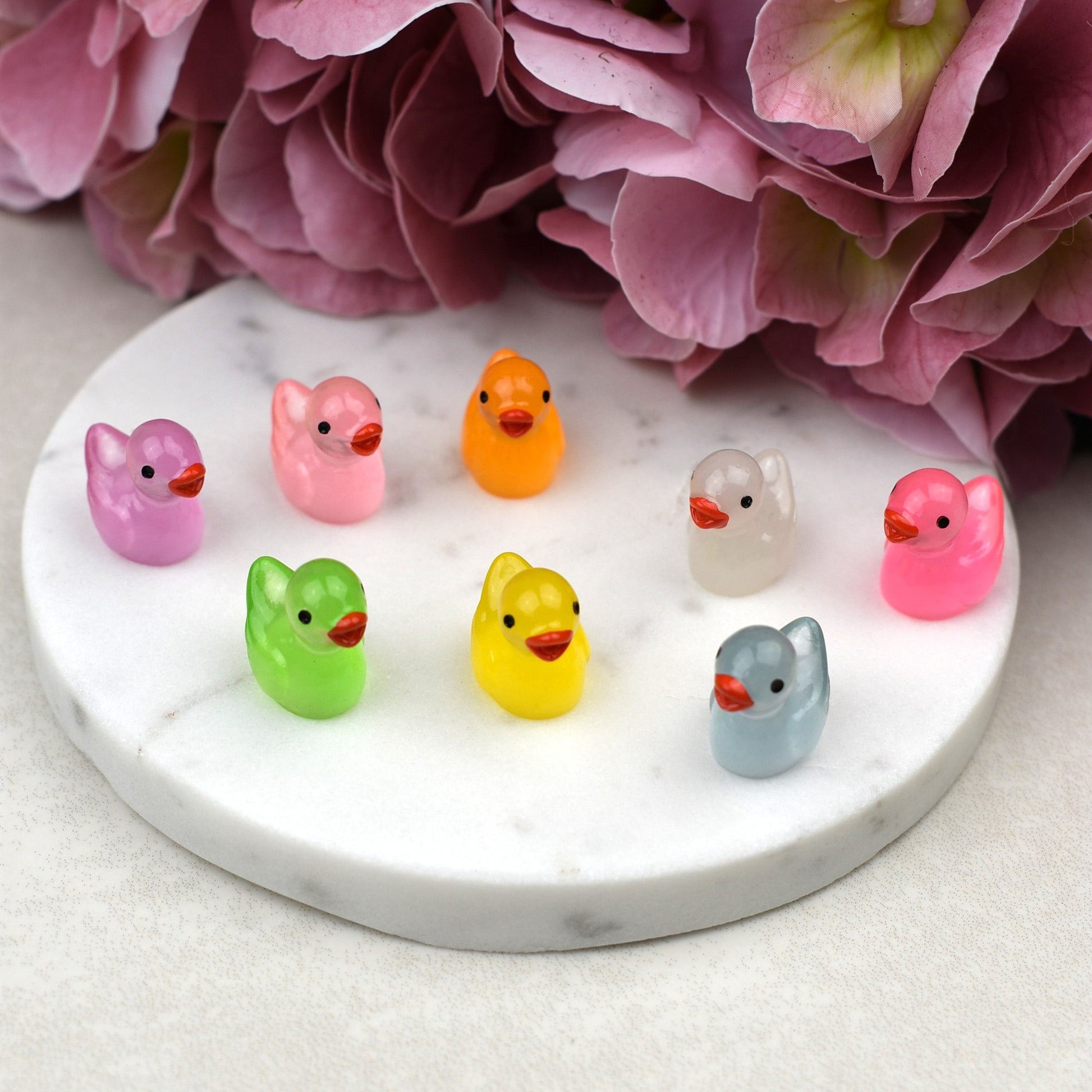 Each good luck duck comes with a presentation card that is printed on FSC certified card and comes presented in white organza bag. Each duck measures approx 1.5cmx1cm. There are several luminous ducks including yellow, light pink, dark pink, light purple, green, orange, white and blue. The duck colour will be chosen at random.