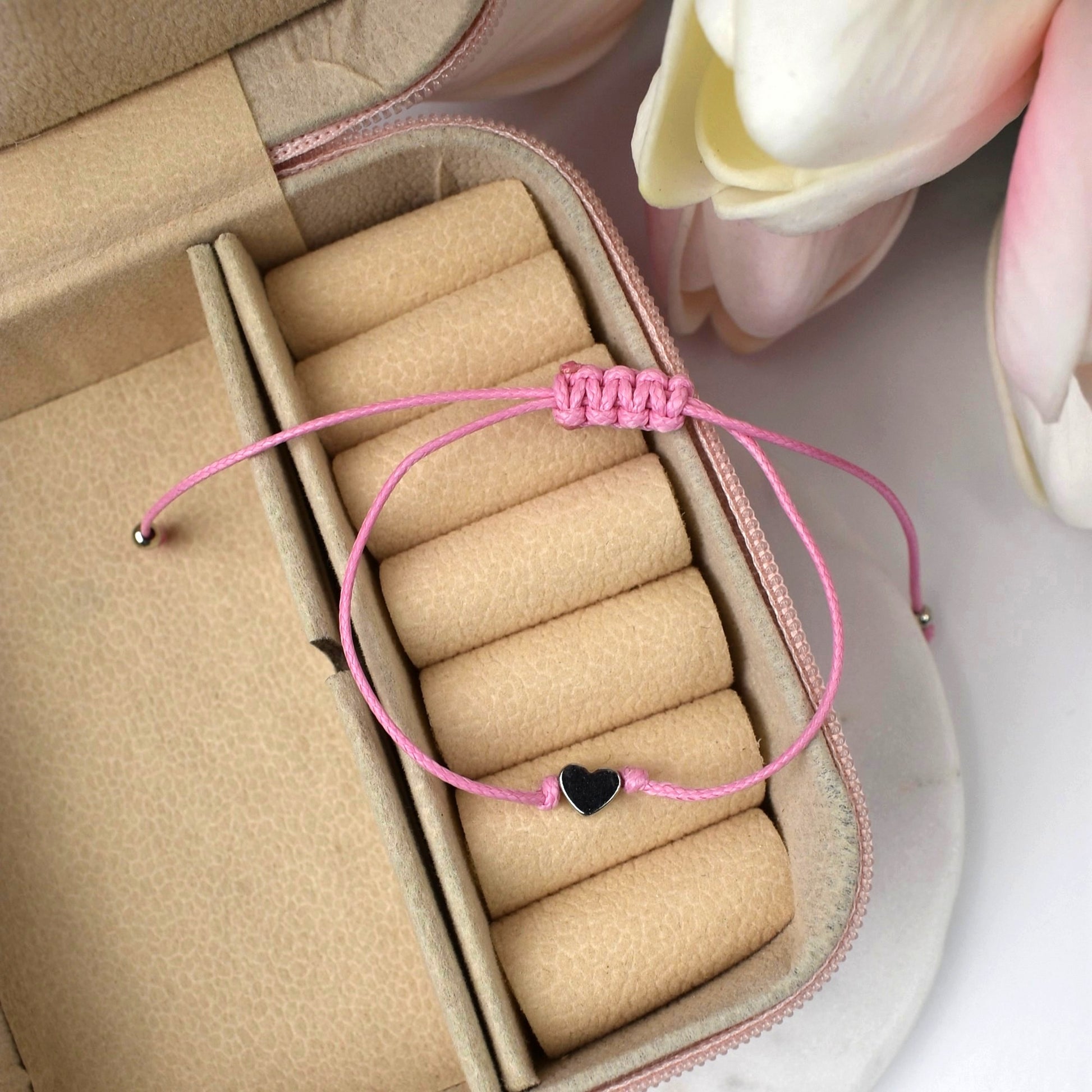 The bracelet features a silver charm (choose from a heart or star from the drop down box) on a coloured adjustable cord. The bracelet can be removed on and off the wrist with the adjustable fitting. There are several cord colours to choose from, which can be chosen from the dropdown box.