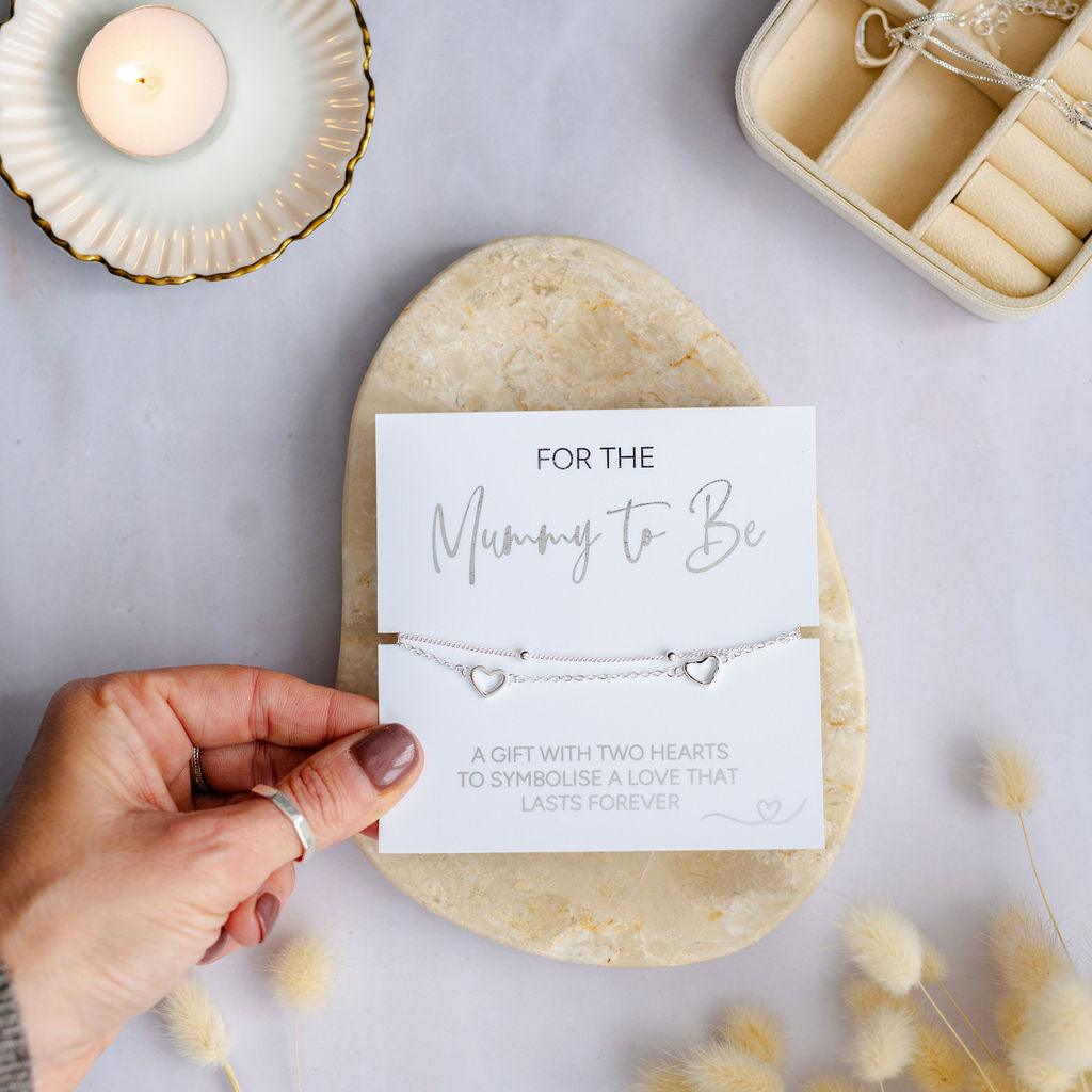 Beautifully presented on a card with silver foil text, ‘For The Mummy To Be’ ‘A gift with two hearts to symbolise a love that lasts forever ’.