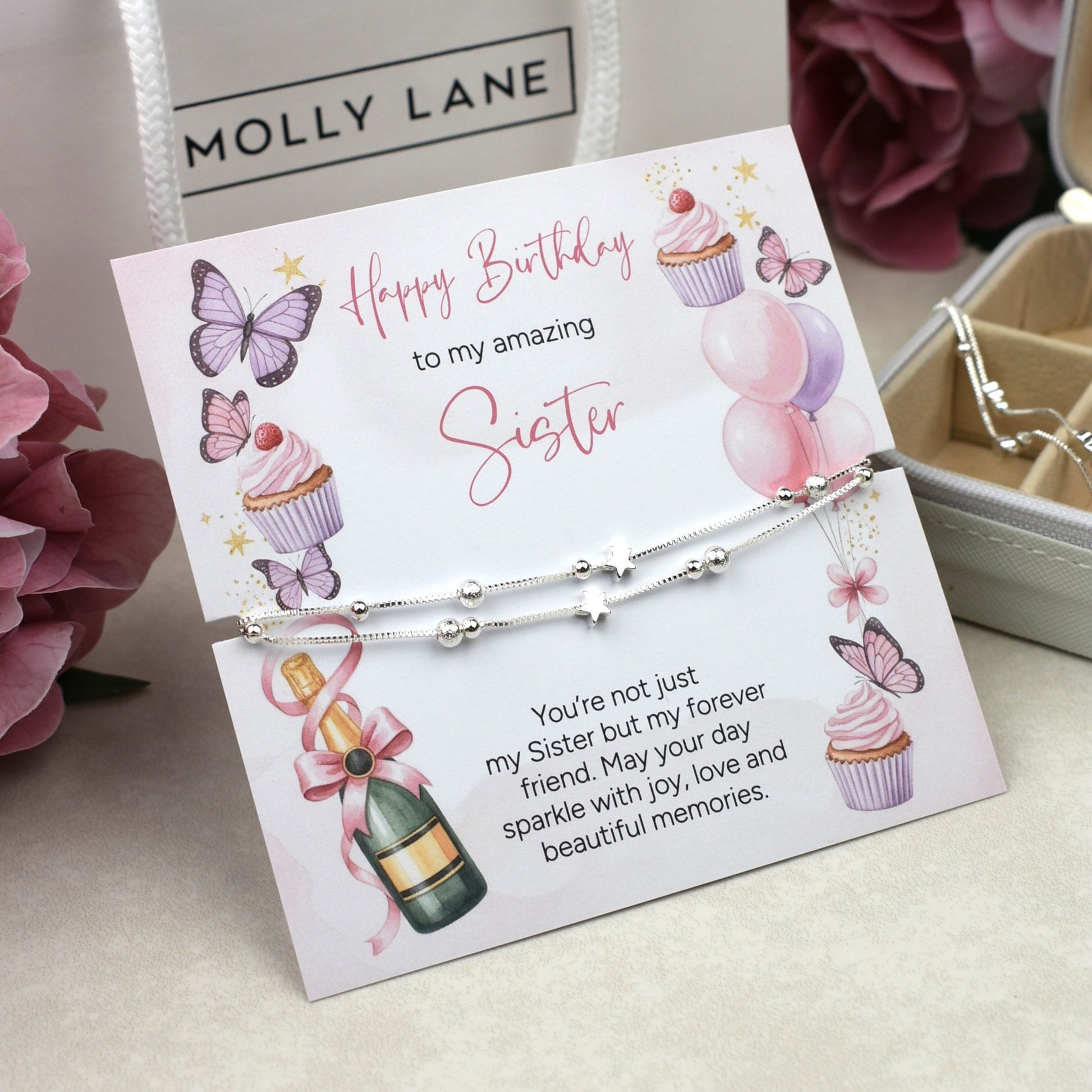 Beautifully presented on a card, ‘Happy Birthday To My Amazing Sister’ ‘You’re not just my Sister but my forever friend. May your day sparkle with joy, love and beautiful memories’.